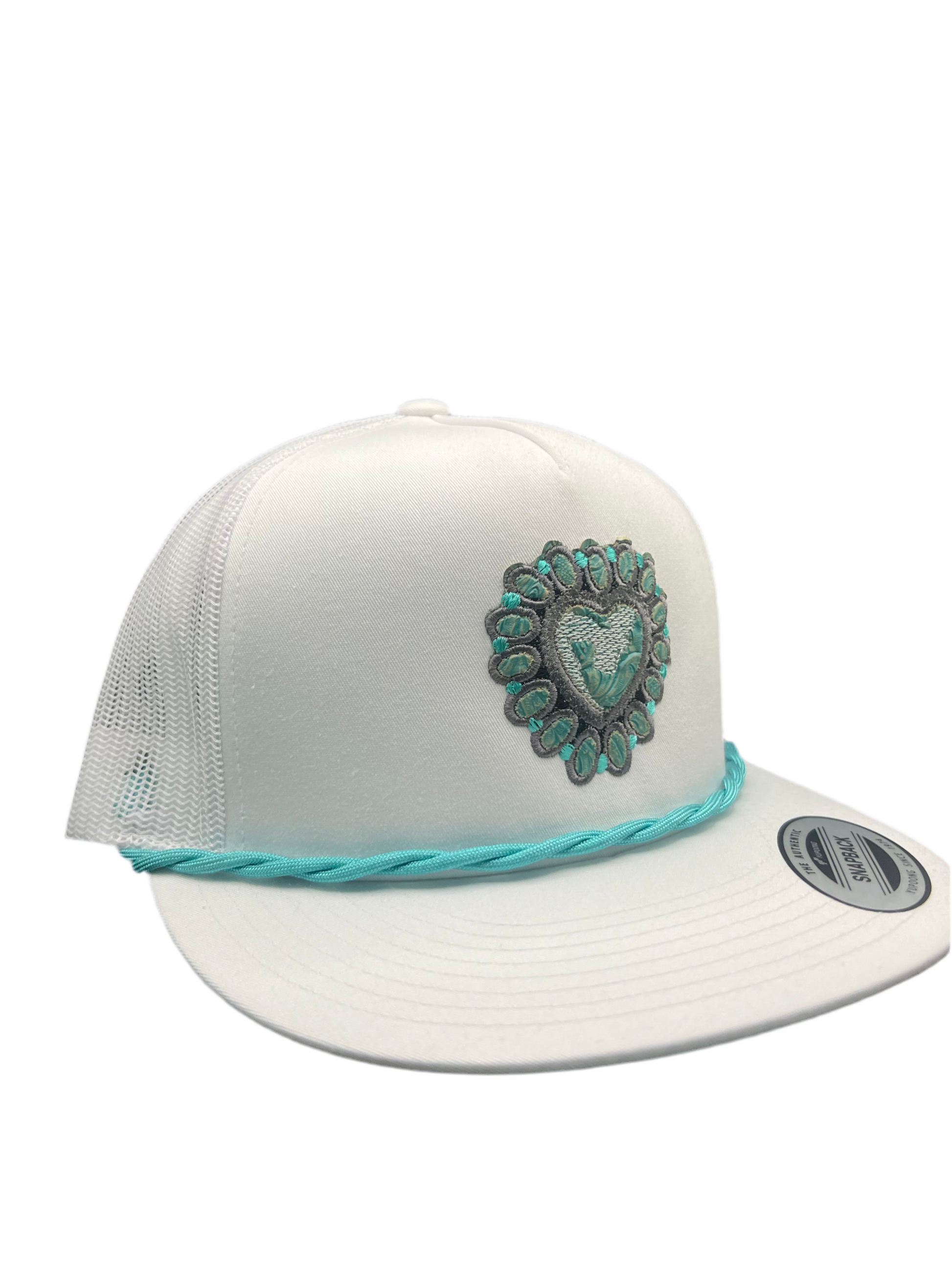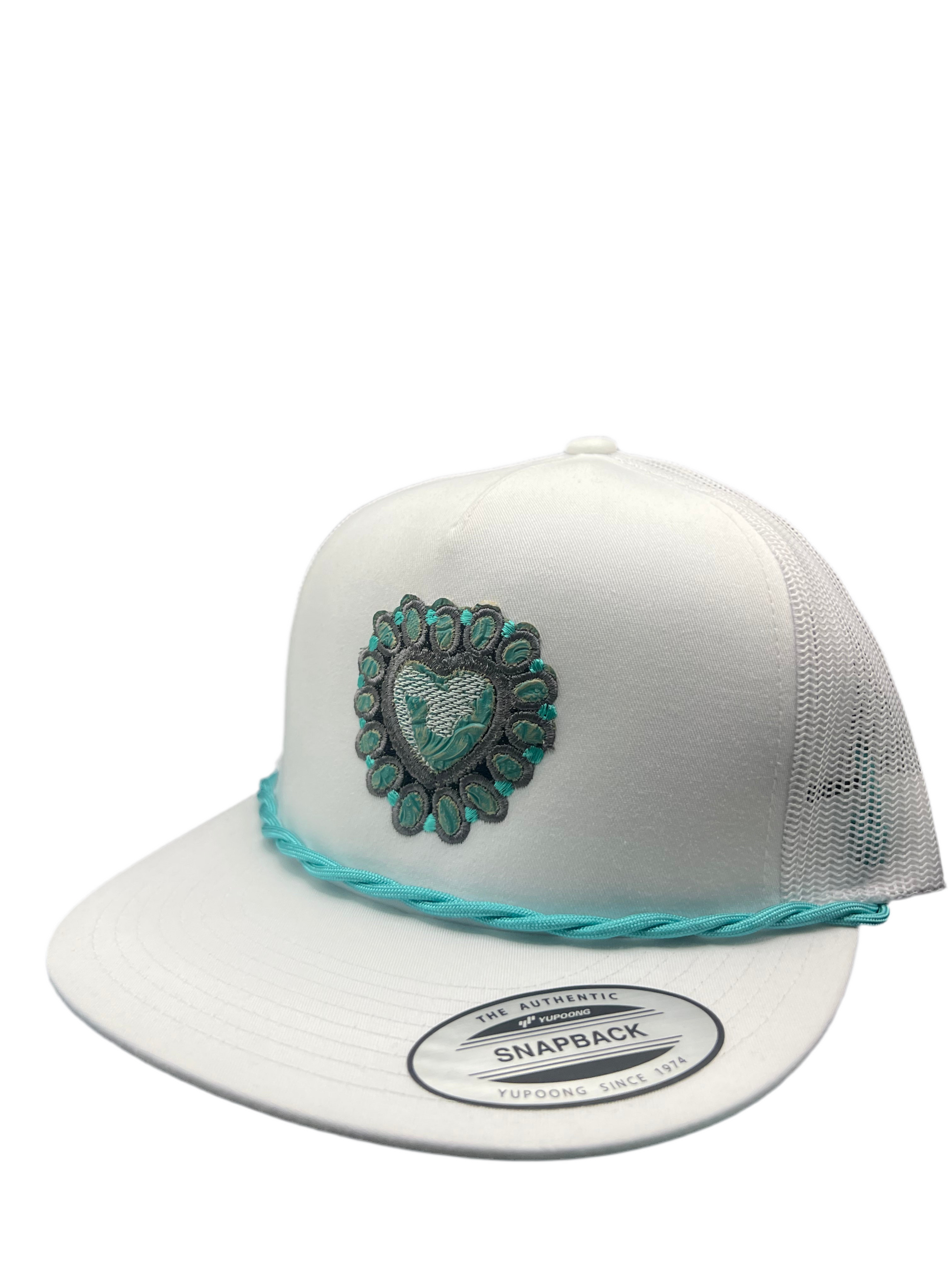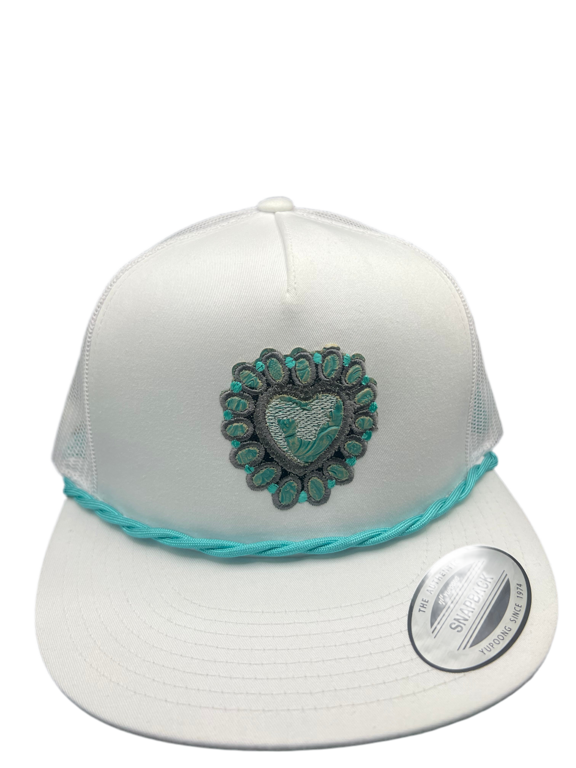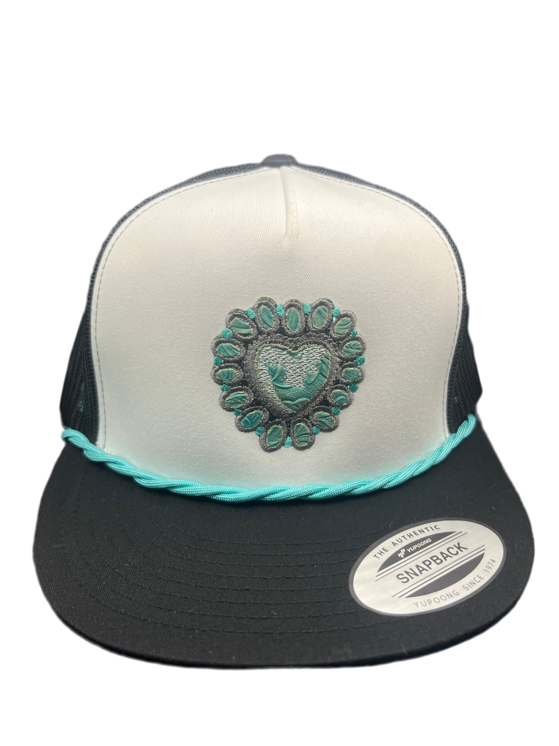 Turn heads with Cowboy Candy - where western grit meets turquoise drip. This bold snapback features a custom embroidered turquoise and black design inspired by classic concho clusters and vintage rodeo soul. Fronted on a structured high-crown trucker with your choice of a black bill and mesh back or a clean all-white finish, this hat rides the line between punchy and polished.