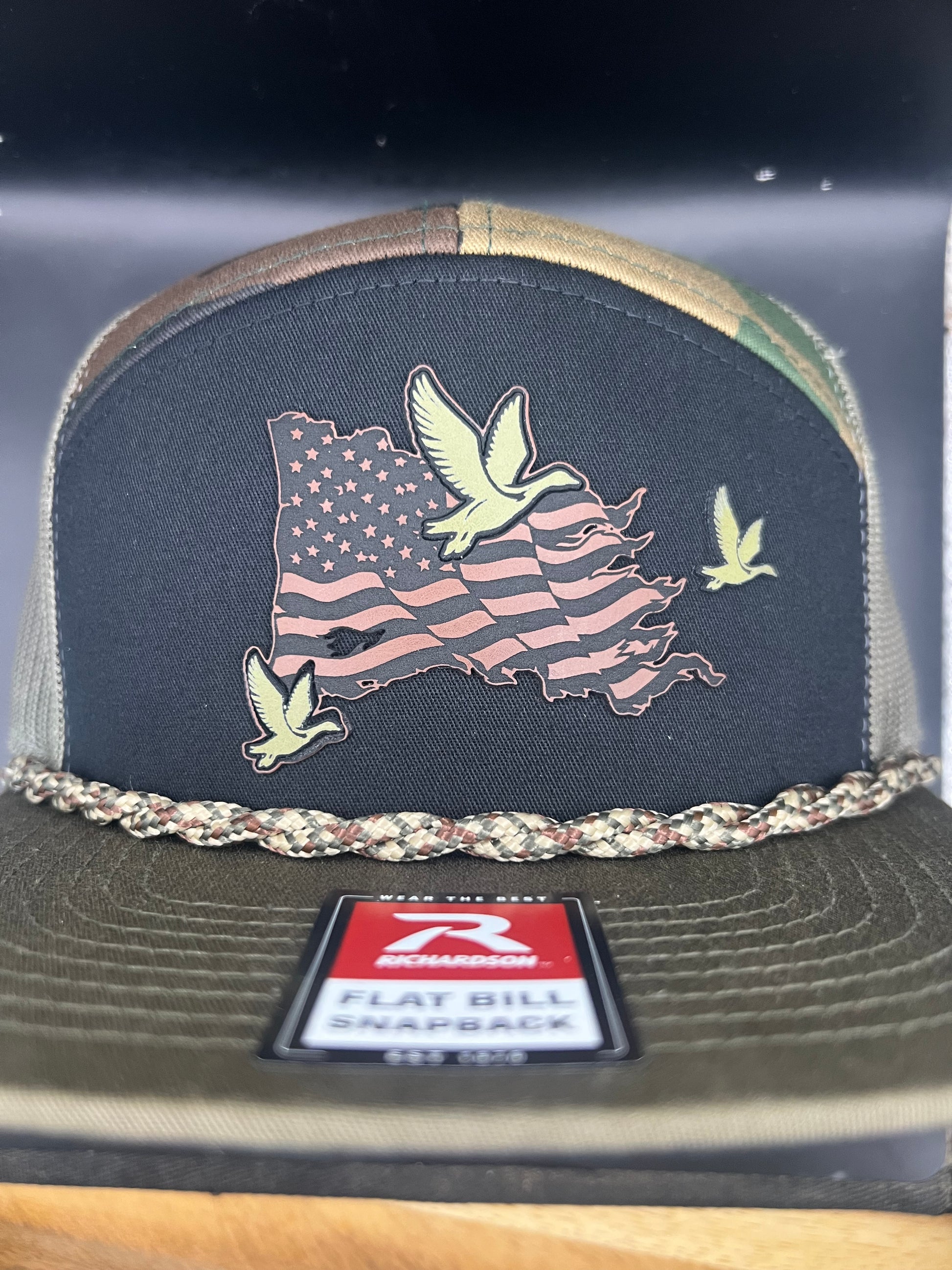 The Stars and Wings Hat is a bold, rugged camo cap designed for those who embrace the spirit of freedom and adventure. Featuring a sleek black face, this hat combines classic camouflage with a modern, striking design. The front showcases an intricate patch of wings and stars, symbolizing strength, patriotism, and the thrill of the open sky. Made from durable, breathable fabric, it's built for both comfort and longevity, whether you're hunting, hiking, or enjoying the great outdoors. The adjustable strap ensures a snug fit, while the unique blend of camo and black adds a timeless, tactical edge.